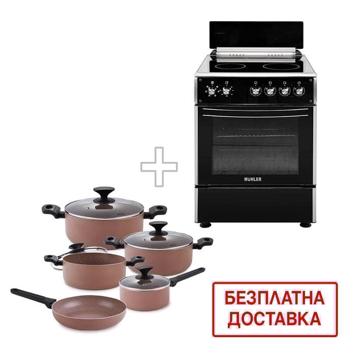- Комплект Muhler Готварска печка ELC-VC622ESS 4В + комплект от 5 съда за готвене серия Kikka