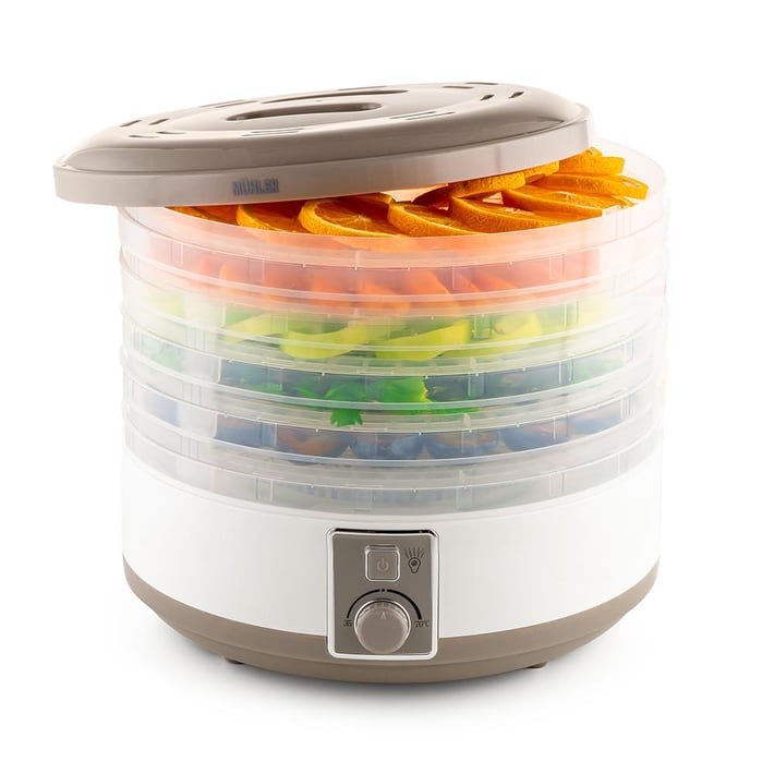 Сушилнята за плодове и зеленчуци MUHLER е подходяща за приготвяне на плодов чипс, стафиди и други дехидратирани плодове и зеленчуци, вегета, плодов пестил, желирани десерти, здравословни плодово-ядкови десерти, сушени месни и рибни деликатеси, сушене на билки, подправки, гъби, приготвяне на кисело мляко или втасване на тесто.